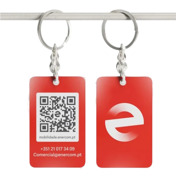 O porta‑chaves Enercom RFID funciona como o cartão: inicia e termina carregamentos com total segurança.